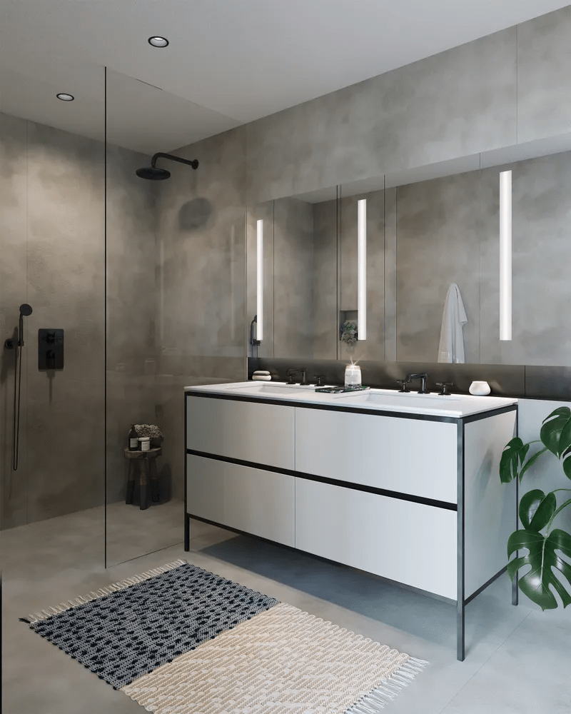 Expansive bathrooms feel even larger with large format floor to ceiling European porcelain tile throughout, creating a seamless, spa-like environment in primary bathrooms. Each bathroom features custom-designed Morris Adjmi anthracite plumbing fixtures for a unique, minimalist modern tone. For the perfect morning and evening routine, vanities illuminate with mirror-mounted lighting.